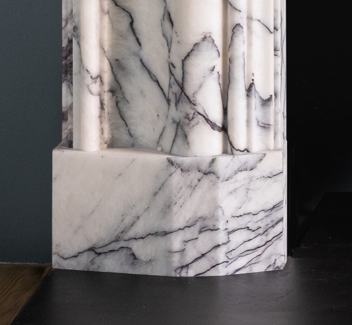 The Milo is a fire surround of substantial proportions that features an elegant bolection moulded frame elevated above canted block feet. Shown here in Lilac marble from Antalya in Turkey.